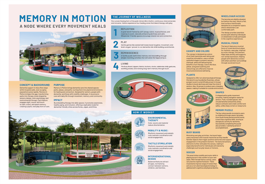 Memory in Motion is a community-based wellness concept that redefines how society supports individuals living with dementia, physical limitations, and other cognitive conditions. The project bridges the gap between costly care facilities and everyday public spaces—transforming community parks and shared environments into therapeutic landscapes where movement, memory, and play naturally intersect.