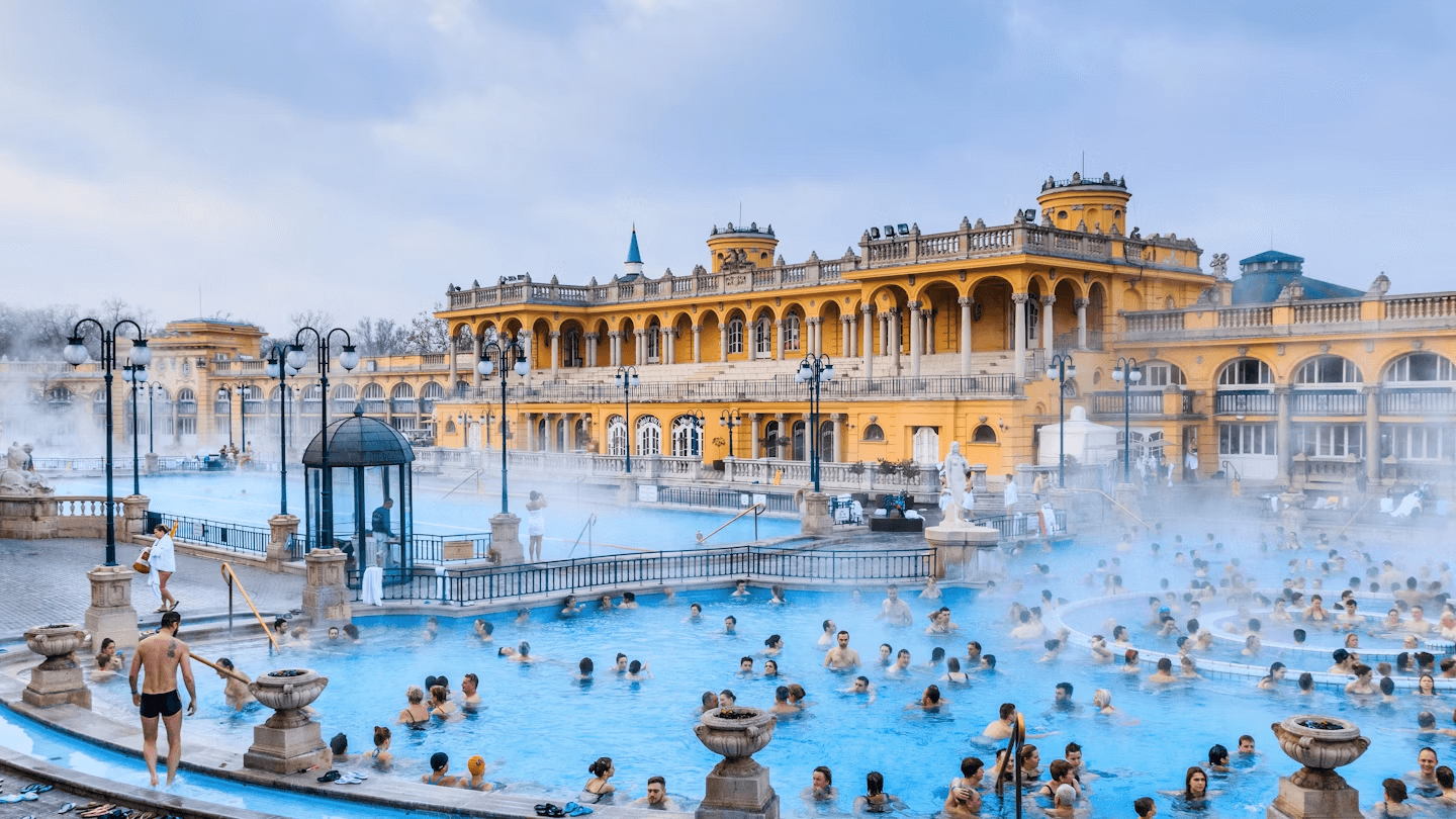 The Széchenyi Medicinal Bath in Budapest is the largest medicinal bath in Europe, drawing its water from two thermal springs with temperatures of 74°C and 77°C. The mineral-rich water contains sulfate, calcium, magnesium, bicarbonate, along with metaboric acid and fluoride.