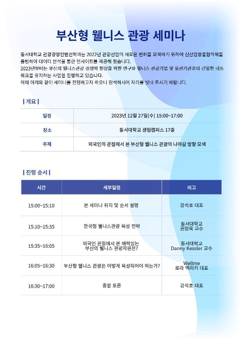 Dongseo University’s Department of Tourism Management and Convention established a new industry creation council to seek new changes in the tourism industry in 2022. Since its launch, it has provided insights through data analysis. From 2023, research will be conducted to improve the competitiveness of Busan’s wellness tourism and a close network with wellness tourism companies and related organizations. Professor Kessler presented was titled ‘Busan’s Wellness Tourism Assets: An International Perspective’ was given to an audience of CEO’s and Professors.